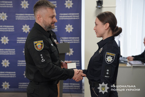 Начальник обласної поліції Сергій Зюбаненко вручив нагороду лейтенанту поліції Оксані Воробій, чия пильність допомогла правоохоронцям викрити масштабну схему розповсюдження наркотичного засобу кратома.