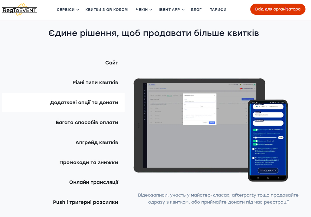 Сервіс пропонує чудові вбудовані маркетингові інструменти: інтеграцію з Facebook та Instagram, автоматичні розсилки та потужну систему аналітики джерел трафіку. Інтерфейс максимально зручний як для організатора, так і для покупця.