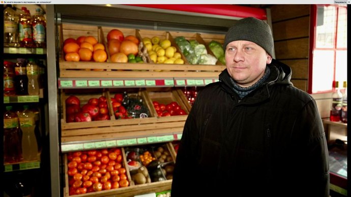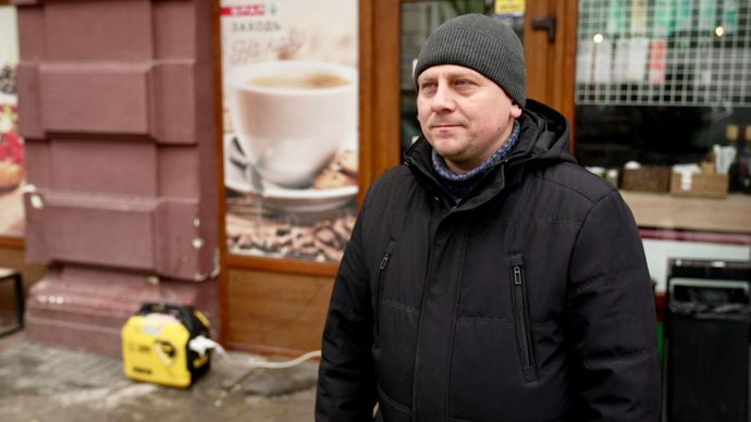 "Загалом картина не дуже, тому що світла з початку лютого практично немає. Годину-дві, максимум три на день є світло, а коли його немає — доводиться працювати на генераторі. Заливаємо бензин і працюємо для того, щоб люди могли придбати собі продукти. Потужність генератора насправді маленька. На ньому працюють лише каси й освітлення, щоб побачити товар, термінали — для зручності, і все. Холодильник він не потягне, кави ми не зможемо зробити через те, що замала потужність. Треба більший, але фактично місця на нього немає. Під магазином не поставимо, бо це центральна частина міста, доводиться економити. За день бензину йде від 5–6 до 8 літрів", — розповідає Сергій Калинович.