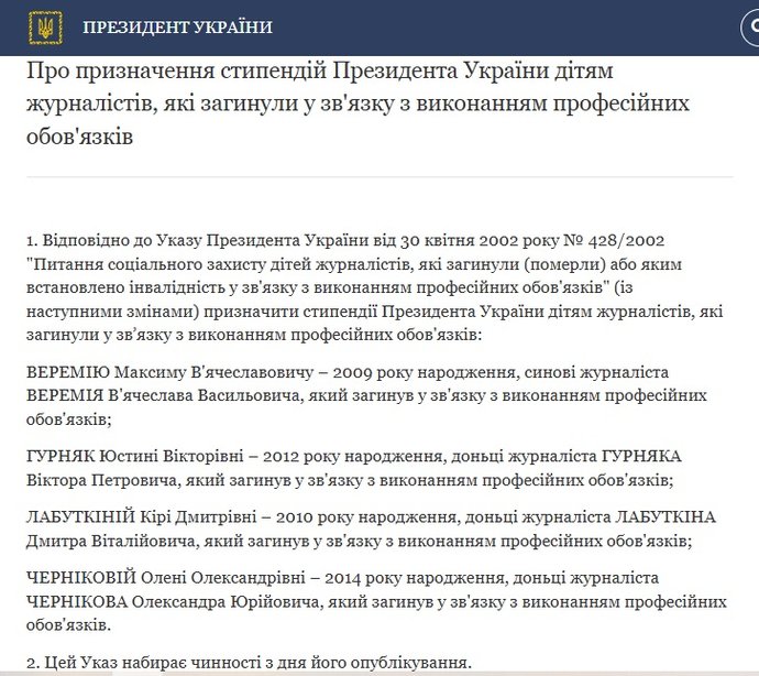 Указ про призначення стипендій дітям загиблих журналістів. Суспільне Тернопіль/Скрин з сайту president.gov.ua