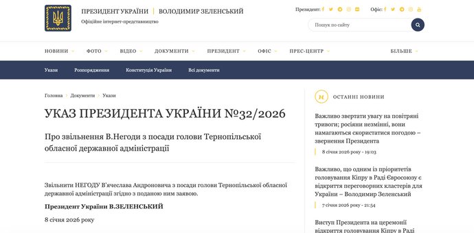 Указ про звільнення голови Тернопільської ОВА. Скрин з сайту офіційного інтернет-представництва президента України