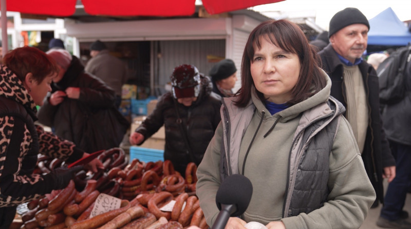 "Торгую від восьмої години. Вранці трохи товару продала. Найчастіше у мене купують шинку, бочок, ковбаску домашню, таку на освячення. Шинка – 420. Бочок – 350. Ковбаска — 350, 380. Є всяка".
