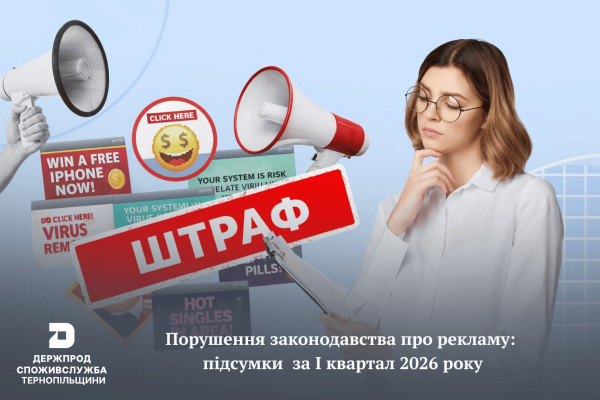 За підсумками І кварталу 2026 року, досліджено 350 рекламоносіїв, за результатами чого встановлено 54 порушення вимог Закону України «Про рекламу». Працювали фахівці сектору контролю за рекламою та дотриманням антитютюнового законодавства, повідомили у ГУ Держпродспоживслужби в Тернопільській області.