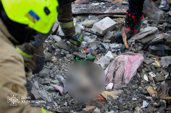 «Тривають пошуково-рятувальні роботи та ліквідація пожежі на площі 300 кв. м. На місці події працюють підрозділи Харківського та інших гарнізонів ДСНС, у тому числі сапери, кінологи та психологи», – повідомили у ДСНС.