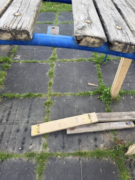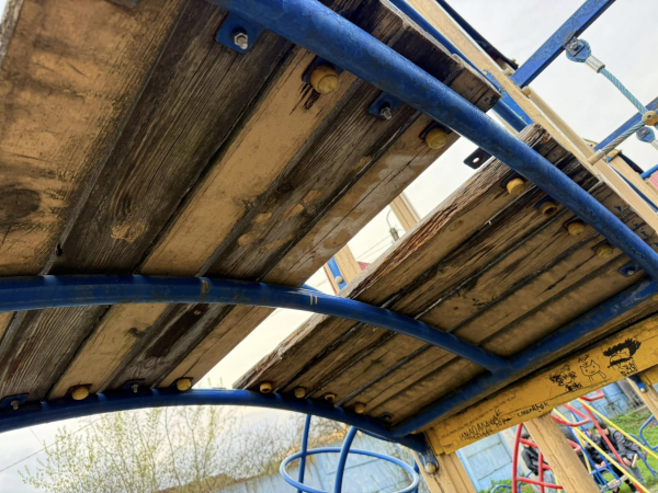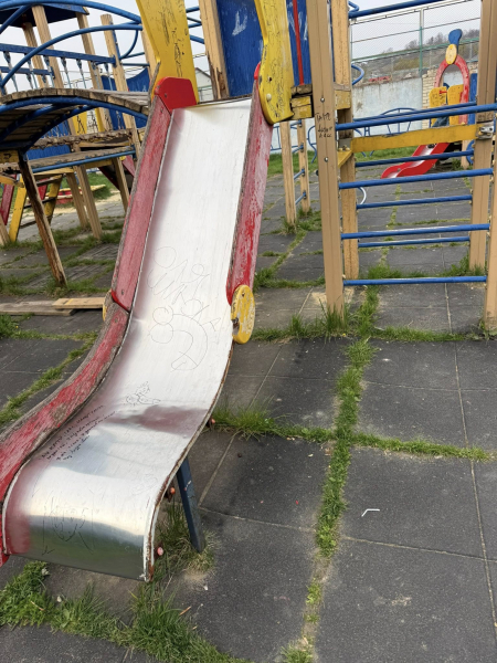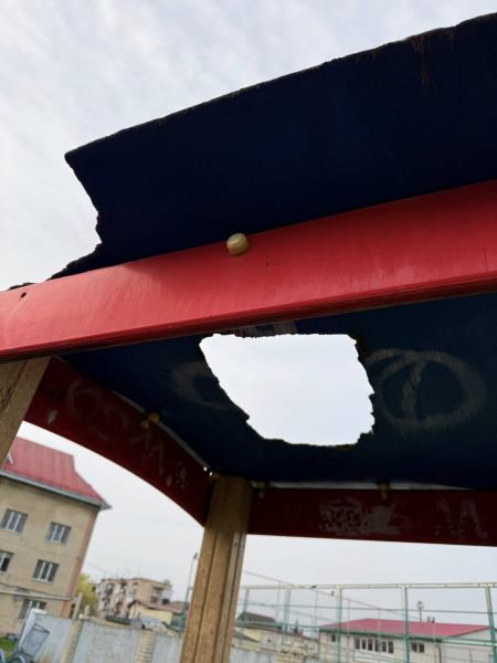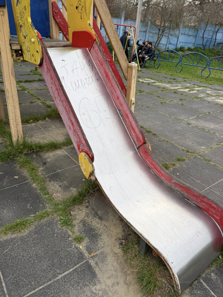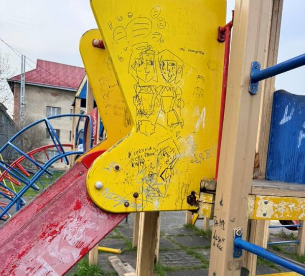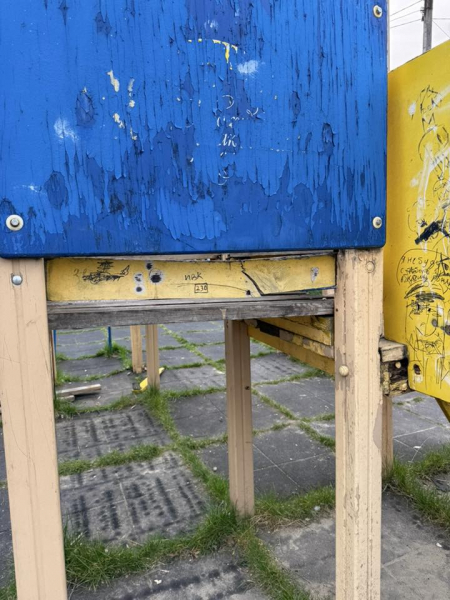 Конструкції розмальовані, понівечені та знищені, деталі розкидані по майданчику.