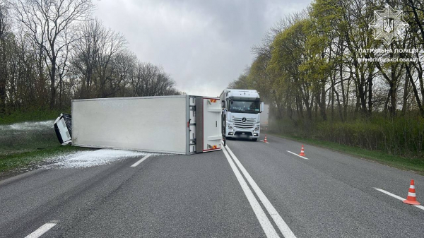 Сьогодні, 26 квітня, на автодорозі “Тернопіль-Львів”, поблизу Зборова перекинулася вантажівка.