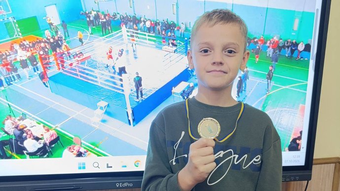 "Сьогодні в 6-А вітали Данила Петровича, який виборов золоту медаль на боксерському турнірі в місті Трускавець. У змаганнях брали участь 150 спортсменів віком від 9 до 14 років із п'яти областей України. Наш Данило — золотий призер. Браво переможцю".