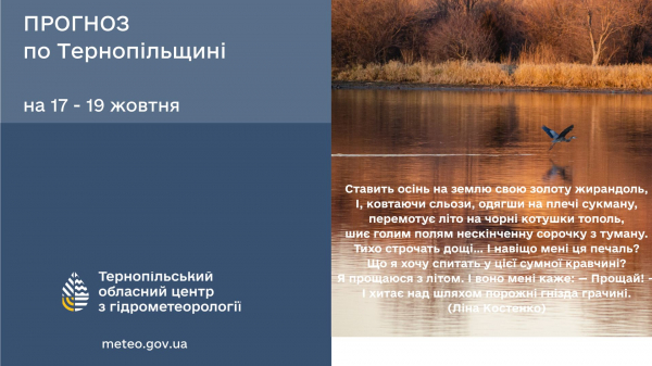 Також за інформацією Тернопільського обласного центру з гідрометеорології, 18 жовтня буде хмарно з проясненнями. Вночі без істотних опадів, а вдень невеликі дощі. Вітер західний, 7 – 12 м/с. Температура вночі 3 – 8° тепла, вдень 9 – 14° тепла.