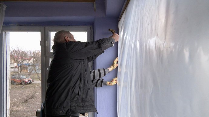 Михайло Марщівський показує вікно, яке затягнув плівкою. Суспільне Тернопіль