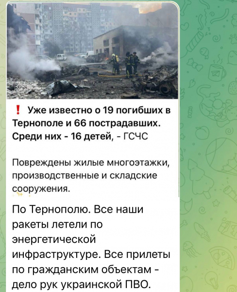 Стерненко навів і приклад російської дезінформації, опублікувавши скриншот із заявами ворожих каналів про те, що «прильоти по цивільних об’єктах – це нібито робота української ППО». Він наголосив, що такі повідомлення містять маніпулятивні твердження та виправдовують цілеспрямовані удари по мирних мешканцях.