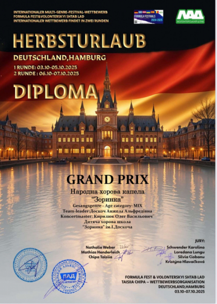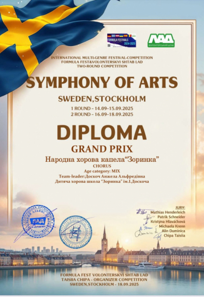 Народна хорова капела «Зоринка» тріумфально завершила серію виступів за кордоном, здобувши одразу чотири престижні нагороди на міжнародних конкурсах у Швеції, Німеччині, Франції та Південній Кореї.