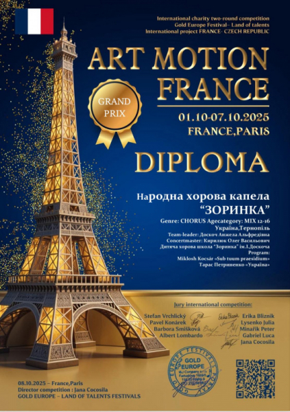 «Народна хорова капела “Зоринка” тріумфально завершила серію виступів за кордоном, здобувши одразу чотири престижні нагороди на міжнародних конкурсах у Швеції, Німеччині, Франції та Південній Кореї. Юні артисти вкотре гідно представили Україну на світовій сцені, прославляючи наше мистецтво далеко за межами держави», — йдеться у повідомленні.
