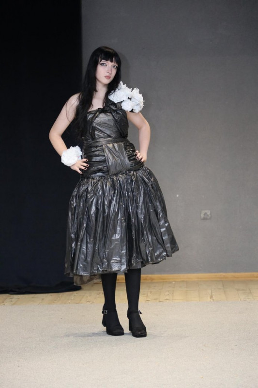 Студент першого курсу Нікіта Білоткач створив сукню зі сміттєвих пакетів. Хлопець родом з Олександрії Кіровоградської області. Працював на своїм виробом упродовж місяця.