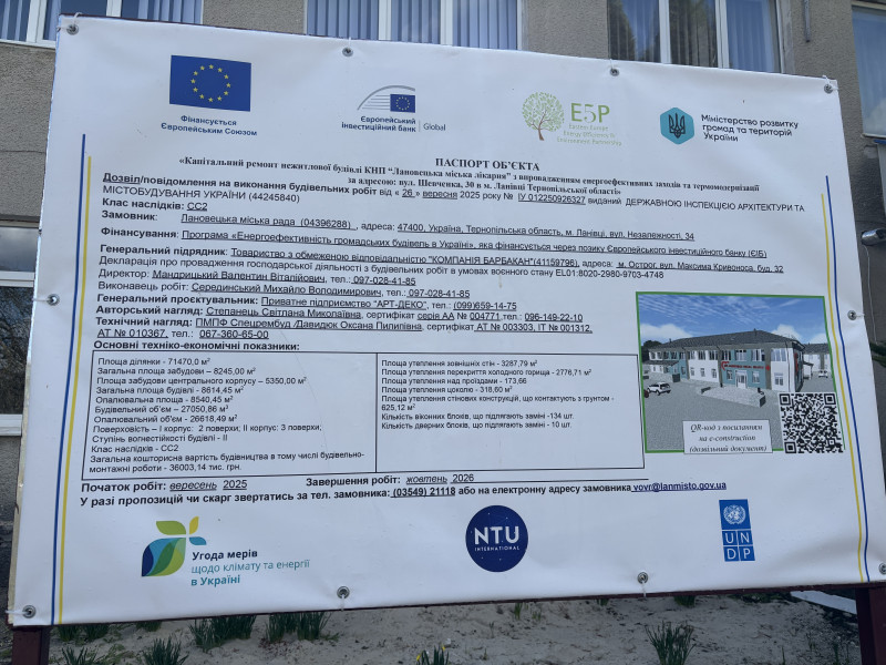 На Тернопільщині утеплюють Лановецьку міську лікарню. Під час капітального ремонту в медзакладі замінять всі вікна та двері, утеплять стелі підвалу, дах будівлі, а також фасад. Мають встановити й нові теплові мережі та індивідуальні теплові пунктиВузол у будівлі, який приймає тепло від зовнішньої тепломережі й регулює, розподіляє та обліковує його для конкретного об’єкта (будинку, офісу тощо)..
