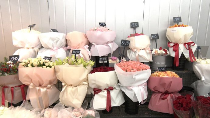 "День святого Валентина — одне з наших улюблених свят. Попит цього свята — це, звісно, червоні кольори, червоні квіти, міксовані букети. І, звісно, попит на квіти, порівняно з попередніми місяцями, в рази більший. Ну, завтра — це на 100 відсотків буде кохання в повітрі і багато квітів на вулицях, я впевнена. Але вже ажіотаж серед хлопців і чоловіків — ще з учора ходять, дивляться, сьогодні активно бронюють. А найбільша кількість людей, думаю, буде завтра. Ми формуємо букети за бажанням клієнта, ціновий діапазон може бути різний. Це може бути букет-комплімент — до тисячі умовно. Може бути і три тисячі міксований і вище. Залежно від ваших побажань".