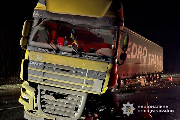 “Інформація про ще одну аварію з потерпілими надійшла на “102” того ж вечора від лікарів екстреної медичної допомоги. На місце події виїжджала слідчо-оперативна група поліції.За попередніми даними, у селі Ступки на автодорозі Стрий-Тернопіль-Кропивницький-Знам’янка-Дніпро-Луганськ-Ізварине водій Volkswagen golf допустив виїзд на смугу зустрічного руху та зіткнувся з автопоїздом у складі сідлового тягача DAF”, – йдеться у дописі правоохоронців.