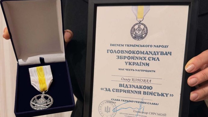 "Це одна з найвищих відзнак для волонтера, як свідчення вдячності, довіри й того, що я на своєму місці. Це символ того, що моя праця помічена тими, заради кого вона ведеться. Коли мене підтримує військо — я не маю права втомлюватися", — написала Ольга Коновал.