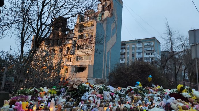 У Тернополі розгорнули пункти допомоги. Правоохоронці повідомили, що відбирають зразки ДНК для ідентифікації поранених і загиблих. Тернополяни приносять квіти й іграшки до зруйнованого обстрілом РФ будинку.