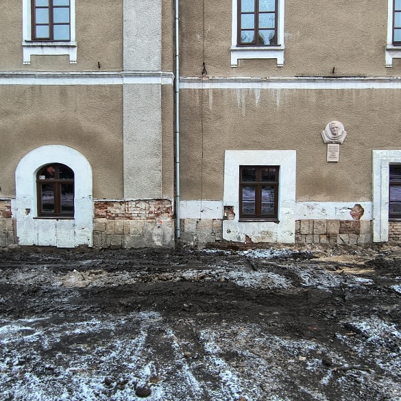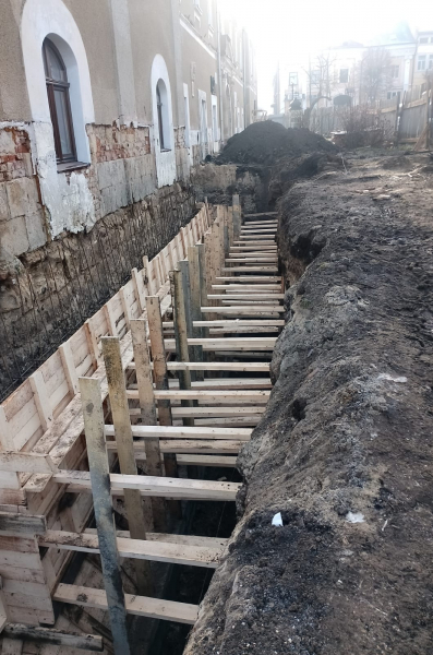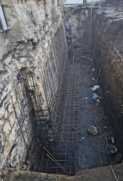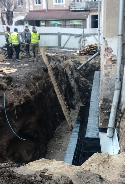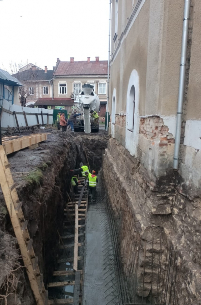 На оприлюднених фото видно, що вздовж стін ратуші проводять земляні роботи: викопано глибокі траншеї, встановлено армувальні конструкції та виконано гідроізоляцію фундаментів. Частину стін укріплюють із застосуванням сучасних ізоляційних матеріалів. Також зафіксовано роботи з бетонування та підготовки основи для подальшого зміцнення споруди.