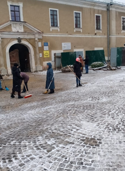 Паралельно комунальні служби впорядковують прилеглу територію, зокрема очищають бруківку перед входом до будівлі.