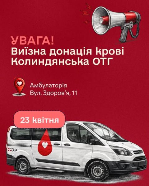 23 квітня у Колиндянській громаді проведуть виїзну донацію крові. Збір відбудеться в амбулаторії за адресою: вул. Здоров’я, 11.