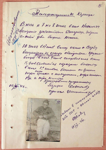 “24 травня 1946 року у Коропці (Тернопільщина) на базу райсоюзу напали повстанці чисельністю 30 осіб. Зав’язався бій. Зрештою це все детально описано в документі. Один повстанець загинув. Псевдо “Рибка”. Родом із Франківщини. Агентура опізнала і визначила, що то якийсь “бандглаварь”. Поки не вдається ідентифікувати, хто саме. Особливо цікавий – головний убір. З кокардою із тризубом, а також трьома кольоровими кульками збоку. Джерело: Архів СБУ”, –йдеться у дописі Володимира Бірчака.