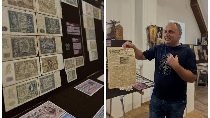 "Я ще з дитинства зберіг трохи паперових грошей і копійок. Не викидав їх. Згодом склав ці екземпляри в альбом, час від часу доповнював. Коли в 2021 році став директором музею, вирішив оформити виставку. Щороку додаємо до неї щось нове. Щороку відкриваємо її до річниці введення в обіг гривні. Надалі плануємо кожен стенд оформити зручною рамкою, систематизувати, розкласти по шухлядах, щоби за потреби легко можна було дістати кожен період чи артефакт".