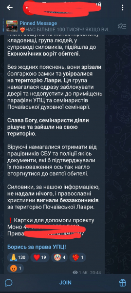 Невдовзі, в одному із мп Телеграм-каналів з’явився допис, що потрібно і надалі фінансувати проект московського патріархату у Почаєві і номери карток.