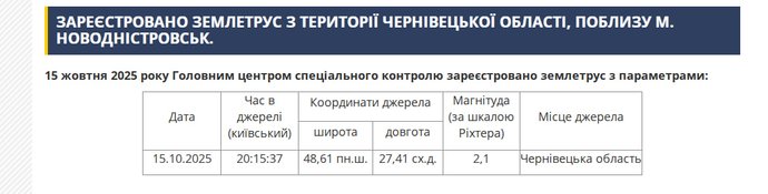 Учора, 15 жовтня, о 20:15 у сусідній з Тернопільщиною Чернівецькій області поблизу Новодністровська зареєстрували землетрус.