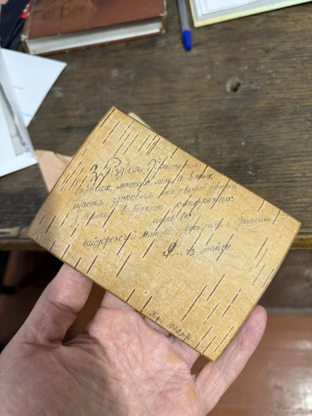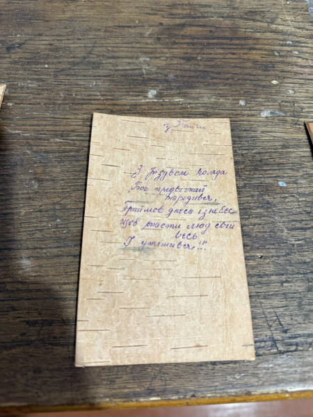 Йдеться про листівки, створені у 1948 році в місцях заслання та адресовані до Тернополя. Їх виготовляли з підручних матеріалів – зокрема на березовій корі, оскільки іншого паперу в таборах не було. Експонати є свідченням радянських репресій проти українців після Другої світової війни.
