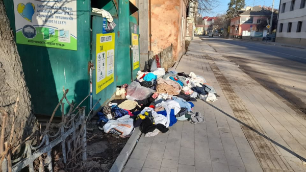 Купи одягу на тротуарі, пакети, розкидані речі — такий «пейзаж» утворився біля контейнерів «Міжнародного фонду добрих людей» на вулиці Острозького у Тернополі.