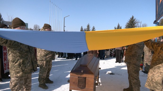 Труну з тілом бійця накрили жовто-блакитним прапором. Суспільне Тернопіль
