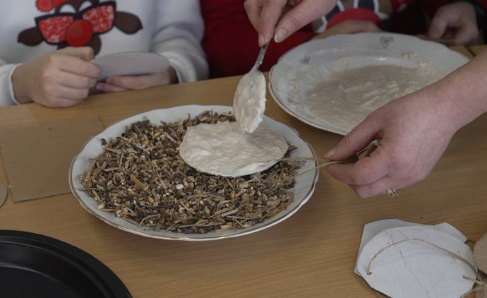 "Перемішуємо наше борошно з водою і воно має бути такої консистенції, як густенька сметанка. І беремо картонні заготовки. Краще із твердих пачок, щоб воно не розмокло. Мокаємо помаленьку в цю суміш. Ми можемо за допомогою ложки або інших якихось паличок допомогти насінню прилипнути".