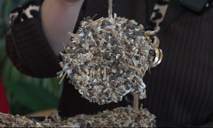 "Такі екогодівнички. Це з картон, борошно і різноманітне насіння вже приготовлене. Кукурудза, соя, пшениця, соняшник є, гречка, ячмінь, овес, просо, рис. Можна, якщо немає насіння, крихти білого хліба черствого засушеного. Але щоб він не був цвілий і не мокрий. Також не можна птахам давати смаженого насіння, наприклад, соняшнику".