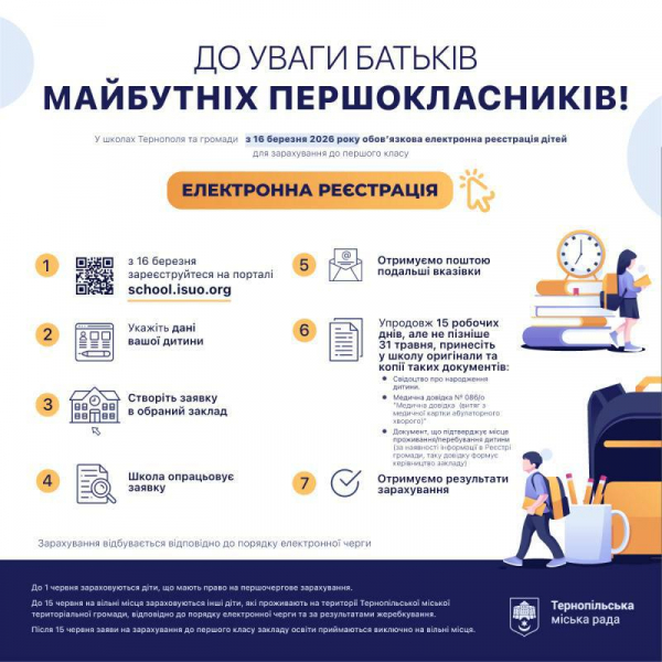 16 березня у Тернополі розпочалася електронна реєстрація та прийом документів до перших класів закладів загальної середньої освіти на 2026-2027 навчальний рік. Зарахування відбуватиметься через систему «Україна. ІСУО» на порталі SCHOOL.ISUO.ORG.