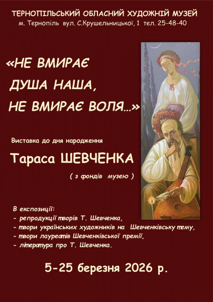 Експозицію під назвою «Не вмирає душа наша, не вмирає воля…» представили з фондів музею. Вона об’єднала живопис, графіку, скульптуру та твори декоративно-ужиткового мистецтва, створені українськими художниками на шевченківську тематику.