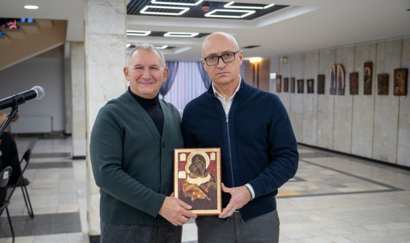 На відкритті митець подарував громаді міста одну зі своїх робіт — ікону Матері Божої Вишгородської.