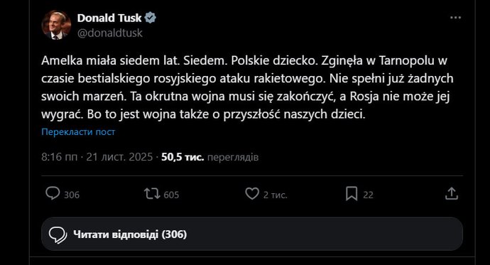 Скрін допису прем’єр-міністра Польщі Дональда Туска про загиблу семирічну громадянку Польщі. Скрін допису Дональда Туска