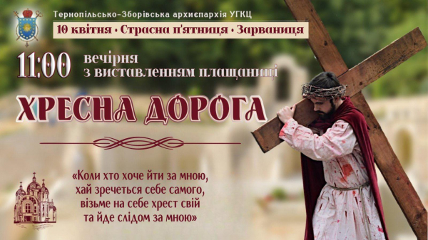 Початок о 11:00 — вечірня з виставленням плащаниці та Хресна дорога. Захід відбудеться у греко-католицькому духовному центрі Зарваниці на Тернопільщині.