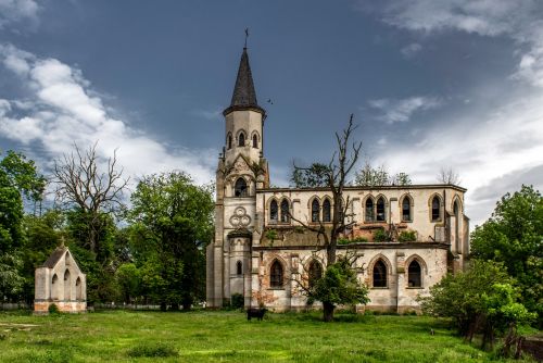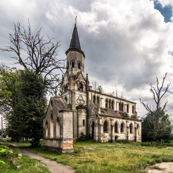 Храм Матері Божої Неустанної Помочі називають одним із найатмосферніших і найфотогенічніших покинутих костелів України. Споруду звели у 1902–1907 роках за проєктом архітектора Міхала Ковальчука коштом графа Міхала Віктора Баворовського та Марії Дунін-Борковської. На фасаді й досі збереглися їхні фамільні герби.