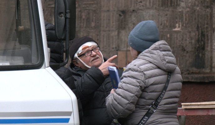"Ракета в подвір’я наше шарахнула, а далі вже нічого не пам’ятаю. Осколки, кров. Сходова клітка була ціла. Ми вибігли обоє. В дружини гірше, її осколками страшно поранило голову, руки, живіт, всю. Бо вона була на кухні, а вікно хвиля вибила і з тим вікном її відкинуло в коридор до меблевої стінки. Там вона впала.