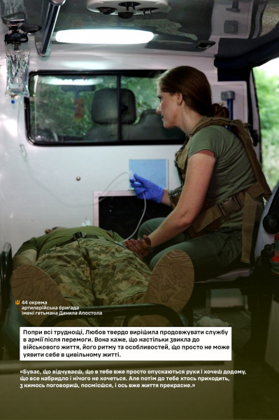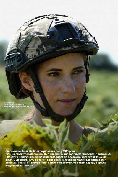«Я всім кажу, що буду служити дуже-дуже-дуже довго! Я дуже чекаю закінчення війни і нашої Перемоги, але я не планую звільнятися з армії, мене тут все влаштовує. Звісно, є свої виклики, як і в будь-якій роботі у цивільному житті, коли встав не з правої, а лівої ноги (сміється). Але я точно продовжуватиму службу в армії. Я вже настільки звикла до цієї службової місії, що просто не уявляю, як би я зараз жила у цивільному житті, просто не уявляю свого життя без війська», – ділиться Любов.