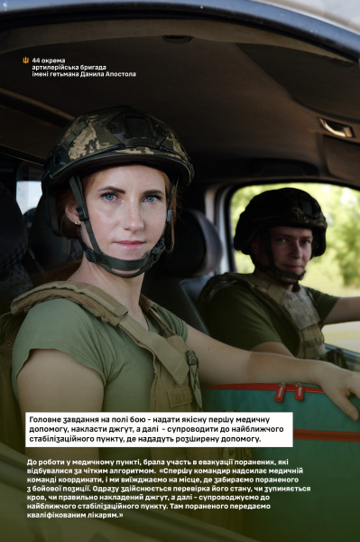 «Спершу командир надсилає нашій медичній команді координати, і ми виїжджаємо на місце, де забираємо пораненого з бойових позицій. Одразу перевіряємо його стан, чи зупиняється кров, чи правильно накладений джгут, а далі супроводжуємо його до найближчого стабілізаційного пункту. Там пораненого передаємо кваліфікованим лікарям, які надають допомогу більш розширену, поглиблену», – пояснює Любов.