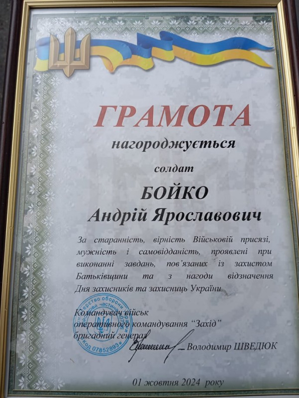 Грамота від оперативного командування “Захід”. Андрій Бойко