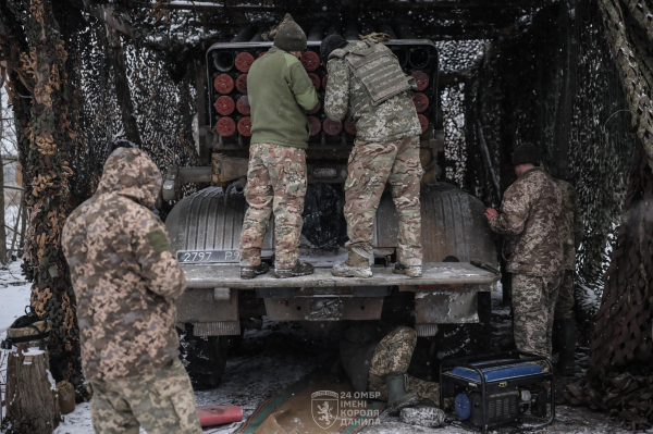 “На світлинах — бойова робота розрахунку реактивної системи залпового вогню “Град” 24 ОМБр імені короля Данила поблизу Часового Яру. Воїни працюють по піхоті, техніці та точках зльоту ворожих пілотів. Отримання завдання, виїзд на вогневу позицію, наведення — і пакет реактивних снарядів накриває цілі, зриваючи спроби противника просуватись”, – йдеться у дописі ТЦК та СП.