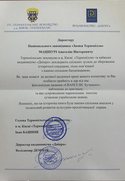 До фондів Національного заповідника «Замки Тернопілля» передали факсиміле Бучацького Євангелія — тобто точну копію цієї старовинної книги.