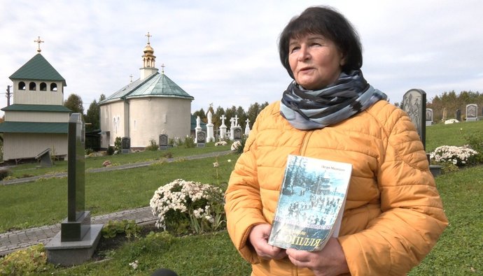 Ольга Шемчук веде до місцевого храму і розповідає, що з книжок Петра Медведика школярі дізнаються про історію і традиції рідного краю.