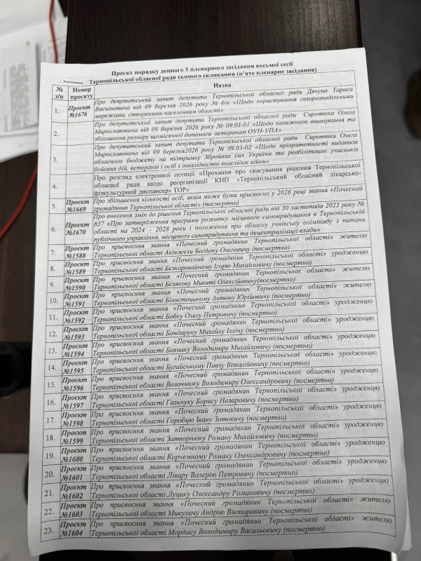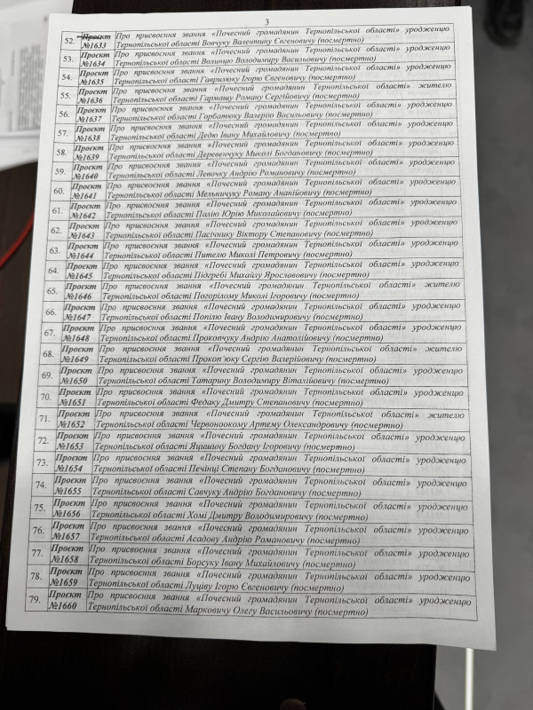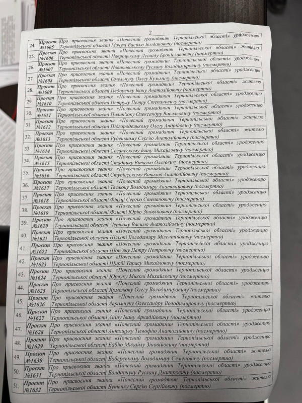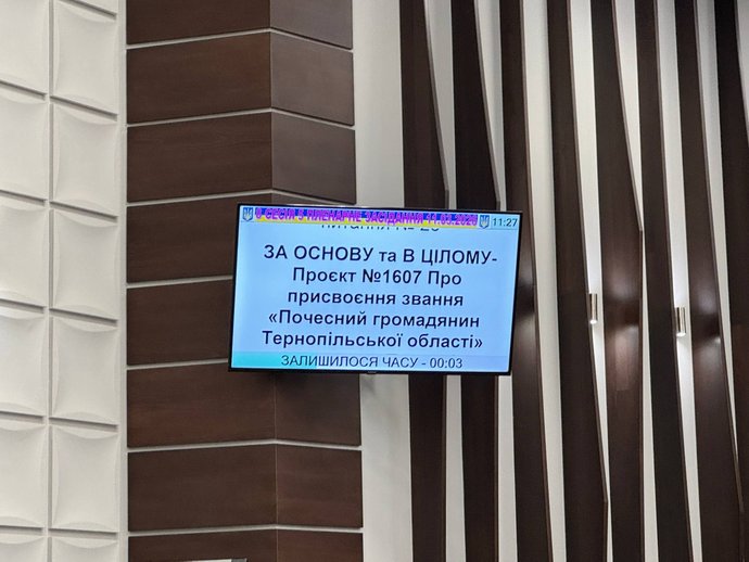 Також усі 55 депутатів, які присутні на засіданні сесії, проголосували за те, щоб визначити більше полеглих військових, яким у майбутньому присвоять звання "Почесний громадянин Тернопільської області".